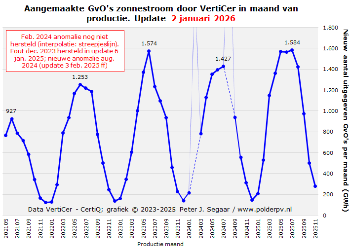 De brondata voor, achtereenvolgens, Klimaatakkoord, Nationaal Klimaat Platform, en het Nationale Energie Dashboard, worden als vanouds berekend door de computers van En-Tran-Ce van Martien Visser, die met steeds geavanceerder modelleringen worden gevoed (energieopwek.nl website). Hierbij dient echter de nodige prudentie betracht te worden. Zoals al langer verwacht door Polder PV, zijn door het CBS recent de capaciteits-cijfers voor zonnestroom in ieder geval voor 2023 en 2024 fors bijgesteld, in laatstgenoemd jaar in sterk neerwaartse richting. Inmiddels lijken de nu actuele productie cijfers op energieopwek.nl als gevolg van die forse bijstellingen, ook te zijn aangepast, want record volumes liggen nu op lagere niveaus. Toen de cijfers nog niet waren aangepast, was er een opmerkelijk verschil met de officiële waarden gepubliceerd door het CBS te zien, met name in 2024 ff., zie de grafiek vergelijking met de maandproducties van CBS versus energieopwek.nl, gemaakt door Polder PV en besproken in het artikel van 21 november jl. De volgende bespreking gaat van de nu actuele (inmiddels gecorrigeerde) volumes op de energieopwek.nl site uit.