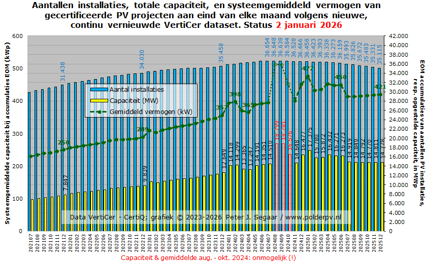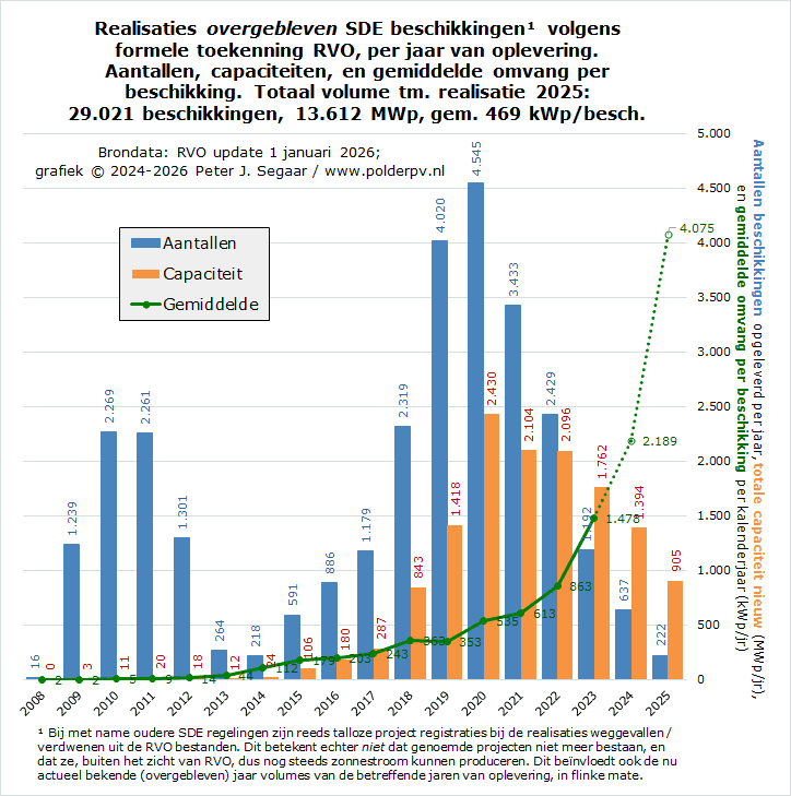 In deze meest recente update is bij de opgeleverde, netto overgebleven capaciteit, door RVO een "officieel" SDE beschikt zonnestroom volume opgegeven van 13.612 MWp (voor peildatum 1 oktober 2025 was dat 13.224 MWp), verdeeld over 29.021 overgebleven project beschikkingen. In het overzicht van 1 juli 2025 lag dat laatste nog op een volume van 29.409 gerealiseerde toekenningen. Wat betekent, dat er, netto bezien, steeds meer registraties verdwijnen bij RVO, dan er in dezelfde periode zijn ingeschreven, in het laatste kwartaal (vergelijkbaar met de al langer vastgestelde trend van netto uitstroom in het omvangrijke VertiCer dossier). In de update van januari 2024 werd de piketpaal van netto dertigduizend gerealiseerde beschikkingen gepasseerd, maar door de toenemende uitschrijvingen bij RVO, is het overgebleven niveau dus weer verder onder die piketpaal gezakt. De capaciteit blijft nog steeds doorgroeien, wat betekent dat er een concentratie is van steeds grotere projecten in de RVO bestanden, en dat met name kleinere gerealiseerde projecten het RVO systeem "verlaten". Wat nog niets zegt over hun status, ze kunnen immers nog zeer lang gewoon doordraaien zonder SDE subsidie. Daar heeft RVO echter in het geheel geen oog meer op, het wordt in ieder geval niet (publiekelijk) gedocumenteerd.