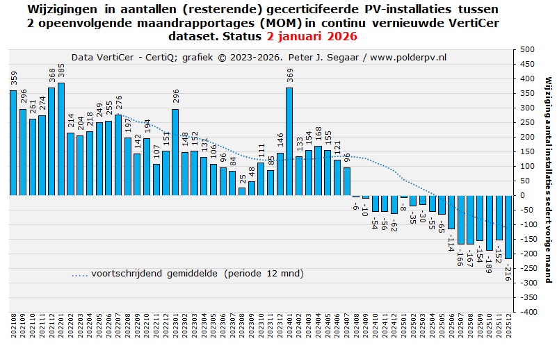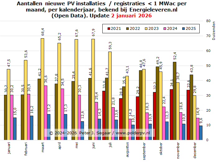 Ook in 2025 bleven de nieuwbouw volumes zeer laag, tussen de 17.329 exemplaren in april, en enkele tussentijdse "laagte records", waaronder, uiteindelijk, het nieuwe dieptepunt in december, met slechts 9.635 exemplaren. Het gemiddelde vermogen per nieuwe registratie, opvallend hoog in juni 2025 (6,18 kWac), bleef flink schommelen, en na een nieuw laagtepunt in november (5,04 kWac), volgde eind van het jaar weer een flinke toename naar 5,55 kWac per nieuwe registratie. Het niveau lag in december 2025, wat de aantallen registraties betreft, 11% lager t.o.v. de aanwas in december 2024, wat zelfs al 50% minder was dan het nieuwe volume in december van het recordjaar 2023.