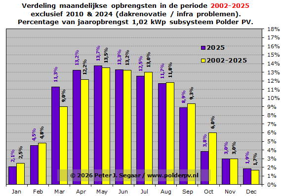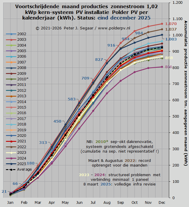 2025 begon met een subgemiddelde opbrengst voor januari, en een licht bovengemiddelde opbrengst voor februari. In maart werd een duidelijke trendbreuk zichtbaar, de curve buigt merkbaar omhoog. Dit kwam sowieso door de record hoeveelheid zonne-uren, en kreeg bovendien een extra "boost", door de systeemrevisie die Polder PV op 8 maart doorvoerde. In april tm. september is duidelijk gebleken dat dit een succesvolle ingreep is geweest, daarbij natuurlijk ook geholpen door het door de bank genomen zeer zonnige weer in deze maanden. De curve is eind september al aardig dicht genaderd richting het exemplaar van het meest productieve jaar (2003), liep enkele maanden zelfs jaar (2022) voorbij, maar is begin oktober krap daar onder op de derde plaats beland. In oktober kwam weer een duidelijke trendbreuk, vanwege zeer somber weer, en viel de curve weer duidelijk terug t.o.v. die voor 2022. De productie in november en december was (flink) bovengemiddeld, waardoor de curve werd doorgetrokken, naar een cumulatieve opbrengst van 1.003 kWh. De op twee na hoogste productie ooit, voor dit deelsysteem.