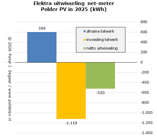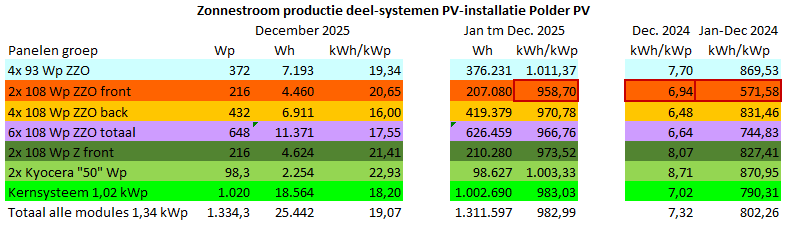 Voor de 12 kalendermaanden van 2025 kwam Boonstra met een specifieke productie van gemiddeld 919,3 kWh/kWp, 12,3% meer productie, dan in dezelfde periode in 2024 (NB: tm. juni was dat zelfs 23,4% meer). De extremen kwamen voor in Fryslân (864 kWh/kWp), resp. Zeeland, met 993 kWh/kWp (14,9% hoger dan in Fryslân). In relatieve zin, was de meeropbrengst t.o.v. januari - december 2024 inmiddels het laagst in Groningen (slechts +4,8%), en, al enige maanden, het hoogst in mijn provincie, Zuid-Holland (14,8%, daarbij Zeeland naar de 2e plek (+14,6%), en Noord-Brabant en Utrecht naar de derde resp. vierde plaats verwijzend (+14,4% resp. 14,3% meer opbrengst). Het oude PV systeem van Polder PV deed het inmiddels, na de uitgebreide systeem revisie op 8 maart jl., in januari tm. december in Leiden, 3,5% beter (983 kWh/kWp, tabel bovenaan dit artikel) dan het provinciale gemiddelde van 950 kWh/kWp. Tot en met mei lag dat verschil nog op het dubbele niveau, bijna 7%, vanwege de zeer zonnige, relatief koele voorjaars-maanden in 2025. De systeemrevisie bij Polder PV heeft dus prima resultaten opgeleverd.