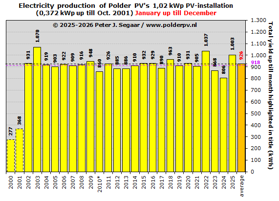 In bovenstaande grafiek is ook weer de mediaan waarde voor de jaren 2002 tm. 2025 weergegeven, in de vorm van de horizontale, magenta streepjeslijn. Deze waarde ligt nog steeds onder het gemiddelde (excl. 2010), op een niveau van 917,8 kWh. De productie in geheel 2025 ligt 9,3% (tm. september nog 12,2%) boven deze mediaan waarde.