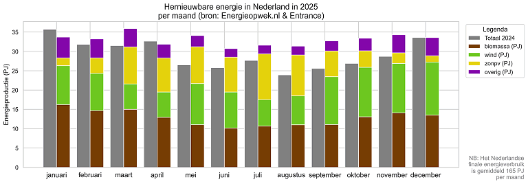 Nationaal Klimaat Platform heeft op 29 december 2025 een voorlopig overzichtje van de producties van hernieuwbare energie bronnen gepubliceerd, voor kalenderjaar 2025. Er zou in dat jaar 7% meer energie (27 petajoule - PJ, "vergelijkbaar met 2x het jaarlijkse energieverbruik van stad Groningen") uit duurzame bronnen (elektra, warmte, en transport) zijn geproduceerd dan in 2024, wat vooral aan een zeer zonnig voorjaar en een winderig najaar zou hebben gelegen. Door blijvende problemen van netcongestie, is het niet gerealiseerde potentieel aan duurzame elektriciteit, door afschakeling van wind- en zonneparken, (geschat) gestegen, van 12 PJ in 2024, naar 16 PJ in 2025. NB: 1 PJ is het equivalent van plm. 278 GWh aan elektriciteit, dat is dus een niet gerealiseerd productie potentieel van ruim 4,4 TWh. Dat is bijna 4% van de totale netto stroomproductie in 2024 (120,2 TWh). In onderstaand diagram wordt de berekende contributie van de verschillende typen inzet per maand weergegeven voor alle energie inzet.