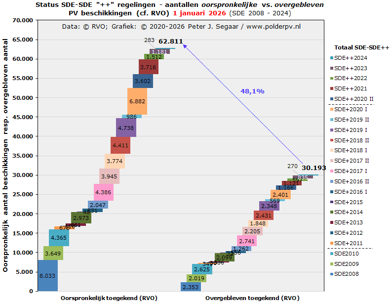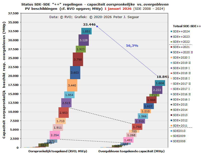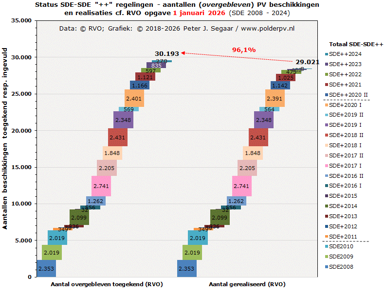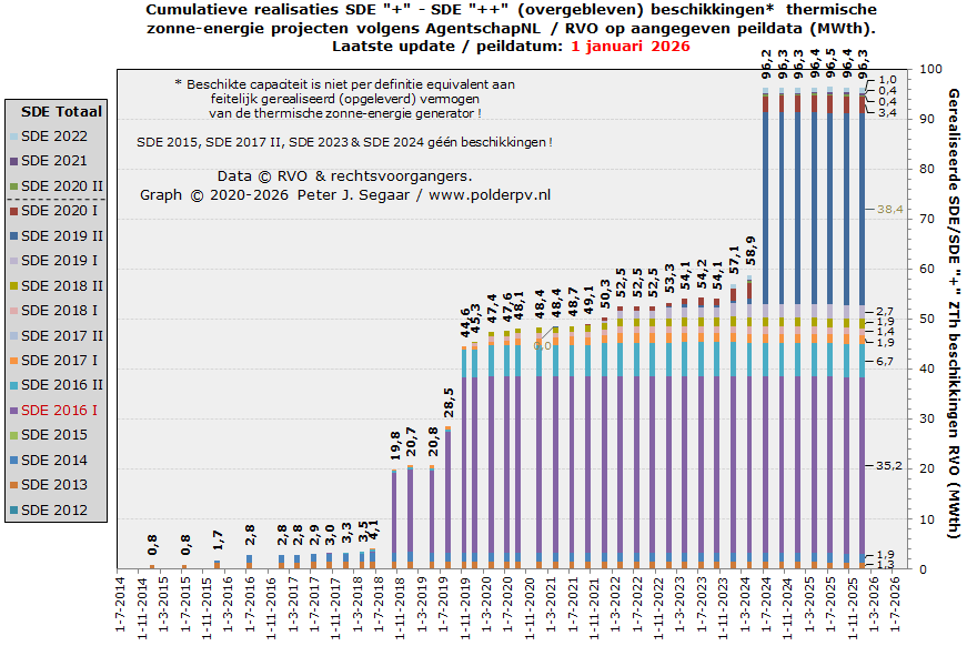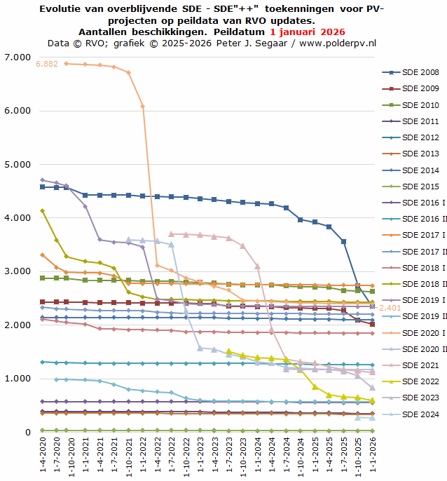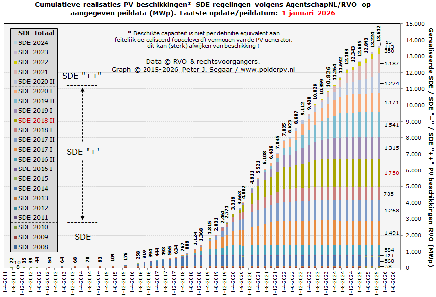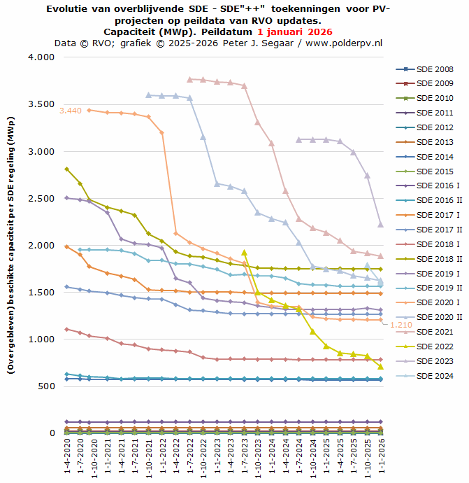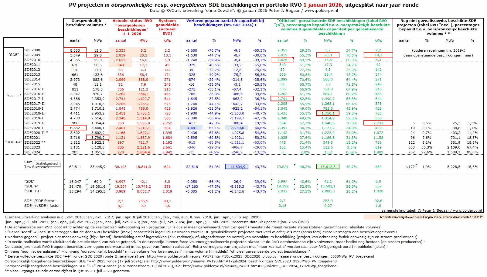 Op 8 januari 2026 verscheen het laatste kwartaal overzicht voor de SDE regelingen in 2025 bij RVO, met peildatum (1) januari 2026, en alle overgebleven beschikkingen en realisaties voor de regelingen tm. SDE 2024. In deze analyse worden de meest recente cijfers getoond. Nieuw toegevoegd werd, t.o.v. de status op 1 oktober 2025, een netto beschikt vermogen van bijna 410 MWp, maar is het totaal aan nieuwe realisaties slechts ruim 388 MWp. Er verdween netto wederom een grote hoeveelheid beschikkingen (verschil tussen realisaties en verdwenen beschikkingen, resp. neerwaarts bijgestelde capaciteit), bij de aantallen vooral veroorzaakt door een grote hoeveelheid uitschrijvingen uit de oudste SDE regeling, SDE 2008. Sinds de update van 1 oktober 2025 zijn er in totaal 803 beschikkingen, "goed" voor 908 MWp aan beschikte capaciteit verdwenen, waarbij SDE 2023 weer de hoogste capaciteit kwijtraakte (522 MWp). De hoogste realisatie werd ditmaal bij de najaars-ronde van SDE 2020 (eerste SDE "++") bereikt, met een toename van ruim 206 MWp verdeeld over slechts 6 beschikkingen. SDE 2023 en SDE 2022 voegden het hoogste aantal toe, 31 resp. 30 gerealiseerde beschikkingen.