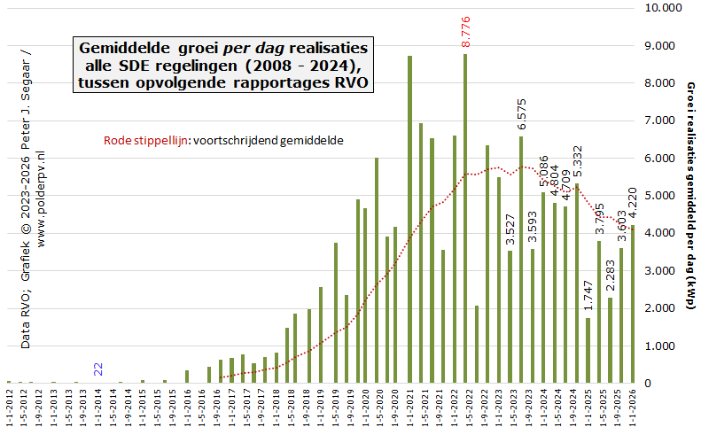 Relateren we de nieuwe volumes aan het opgeleverde (beschikte) vermogen per dag, is er in de huidige versie, voor het totaal van alle SDE regelingen, in het laatste kwartaal van 2025, gemiddeld 4,2 MWp per dag gerealiseerd, 17% meer dan de 3,6 MWp/dag in het derde kwartaal van 2025. Het gerealiseerde volume is bij de realisaties dus weer wat toegenomen in de SDE gedreven projecten markt. Records (QI 2022, 8,8 MWp/dag gemiddeld) zullen zeer waarschijnlijk niet meer worden gehaald, gezien de blijvende, grote problemen bij met name de actuele elektrische infrastructuur.