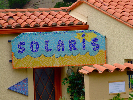 ^^^ Voorproefje voor het latere Spaanse "Gaudiaanse mozaïekgeweld" alvast op Frans grondgebied, geheel naar de smaak van de op Biohummer® passerende polderboy. Zeer toepasselijk uithangbord op villa "Residence Solaris" in het fraaie mediterrane kustplaatsje Banyuls-sur-Mer, enkele kilometers voor de Frans-Spaanse grens in de Catalaanse Pyreneëen. |