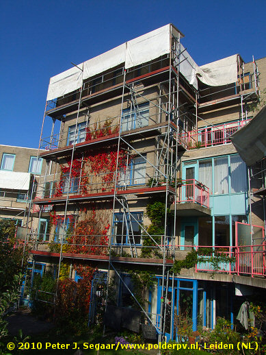 ^^^ Links op het achterste zeildoek ligt, door mij gefixeerd aan een steigerpaal, de eerste volledige "kabelset plus doos" van het andere Polder PV deelsysteem reeds netjes ingepakt in een stevige puinzak, niet in de weg liggend voor de aan het dakvlak te verrichten werkzaamheden. Zodra alle modules weer terug zijn geplaatst, kan eenvoudig de hele batterij modules zo weer worden aangesloten. De modules zullen in drie fasen worden verplaatst op het dak zonder er af te hoeven: eerst alles naar een helft, zodat de vrijgekomen helft gerenoveerd kan worden, dan de boel naar die helft verplaatsen en de rest renoveren, en als laatste alles weer terugplaatsen (marginale modificatie in gedachten bij PPV), en weer aansluiten. |