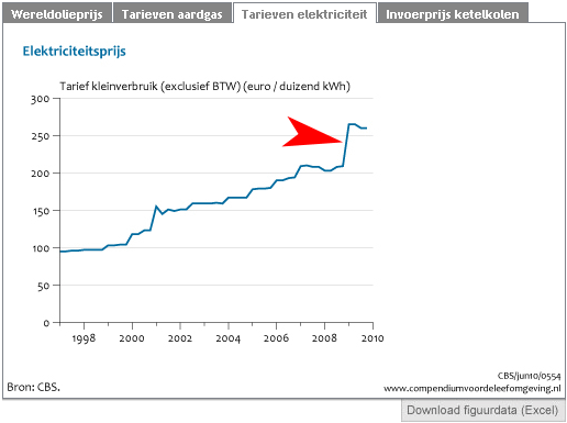 * N.a.v. een e-mail die ik daarover kreeg: natuurlijk bedoel ik hier beslist niet "het eindresultaat op de jaarnota", want dat is een grote, voor 99% van de bevolking gek makende verzameling van talloze posten, waaronder een onrustbarende hoeveelheid niet door gedrag te beïnvloeden vastrechten. Ik doel hier louter en alleen op de variabele kosten voor elektriciteit, dus uitsluitend de kWh prijs inclusief energiebelasting en 19% BTW (en, tot en met 31 december 2008: de variabele component van transportkosten bij netbeheer, per 1-1-2009 vervangen door een absurd hoog uit de duim gezogen capaciteitstarief: een niet meer beïnvloedbaar vastrecht van formaat, dus...).