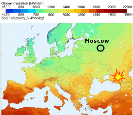 © PVGIS © European Communities, 2001-2008* PVGIS kaartje van Europa met horizontale instraling en/of haalbare jaarproductie in kWh bij optimale opstelling en performance ratio van 0,75. Rechts bij de ster de lokatie van de in zuid Rusland te bouwen 12,3 MWp micromorf-Si dunnelaag PV-plant in Kislovodsk Spa (noord-Kaukasische regio). |