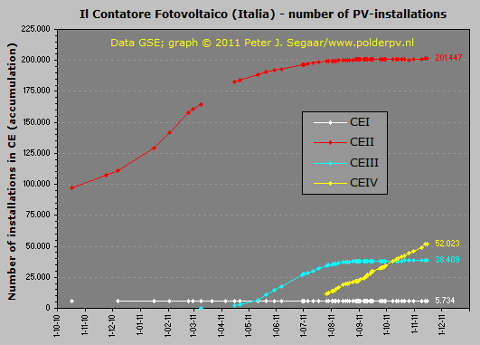 Geluk bij een ongeluk: Deze harde financiële cap betreft uitsluitend de "grote" installaties in Italië. Die worden in C.E. IV opnieuw gedefinieerd: alles boven 1 MWp op daken, en alles vanaf 200 kWp in vrije veld systemen. Vooral die laatste categorie gaat dus harde klappen krijgen, want daar waren de grootste winsten te maken met gigantische aantallen spotgoedkoop in vele containers naar Italiaanse havens versleepte Aziatische modules. En worden die gegarandeerd nog vele jaren met de binnen no-time uit de grond geramde installaties in zonnig Italië over een lange periode van 20 jaar verzilverd door machtige investeerders-conglomeraten... Dus daar hoeven we echt geen traan om te laten.