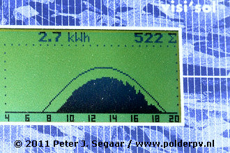 16 oktober 2011: Laatste spiegelei van het seizoen? Vandaag hadden we voorlopig de laatste kans om - gezien het geweldige weerbericht - "een mooi spiegelei" te kunnen scoren. Zo zijn we hier grappend de vermogenscurve gaan noemen die volautomatisch wordt "getekend" op het hier al vaker genoemde Visi'Sol display, wat het geaccumuleerde vermogen van een deelgroep van 688 Wp laat zien (alle zes in de voorste rij staande PV-modules plus de twee in serie geschakelde, prima werkende Kyocera 50 Wp panelen).