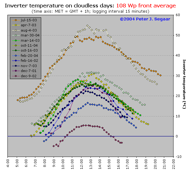 Uiteraard geldt ook voor de gemiddelde vermogensoutput van de 108 Wp AC-modules dat het maximum rond het middaguur ligt. Althans, bij de onbeschaduwde panelen/situaties (grootste deel van het jaar). De maximale vermogensoutput is 55 Watt op 9 december 2002 en maar liefst 89 Watt op 7 april 2003, hetgeen neerkomt op een verschil van ongeveer 38% t.o.v. het maximaal behaalde vermogen. Let ook op het forse verschil in maximaal behaald vermogen op de onbeschaduwde 108 Wp modules in vergelijking met de 93 Wp exemplaren: 89 i.p.v. 73 Watt, een verschil van 18%, op 7 april 2003, en 55 i.p.v. 43 Watt, een verschil van maar liefst 22%, op 9 december 2002. De 108 Wp modules presteren beduidend beter met de OK4 inverters. Klik voor "on-the-spot" vergelijking van de 2 grafieken op de tekstlink achter <ROLLOVER image>. Zoals reeds gezegd bij de vermogenscurves voor de 93 Wp AC-modules (zie opmerking aldaar), worden op wolkeloze dagen NOOIT absoluut de hoogste vermogens gehaald door de accumulatie effecten van de opwarmende zonnepanelen en de omvormers die hun warmte niet efficiënt kwijt kunnen. Toch komt de vermogenscurve van 7 april dicht in de buurt van het maximale output vermogen wat ooit (kortstondig) is gemeten voor de 108 Wp modules (14 mei 2004: 94 Watt, tussen "wattenwolken" in). Dit komt omdat op deze zeldzaam mooie voorjaarsdag er een koude oostenwind stond die zowel de zonnepanelen als de eronder gemonteerde omvormers op een lage temperatuur hield, hetgeen een grote impuls op het rendement bleek te hebben. Op warme zomerse, wolkeloze dagen komt het piekvermogen van de 108 Wp AC-modules op zijn hoogst iets boven de 80 Watt uit; als het niet waait kan dat nog minder worden. Schaduweffecten (1) De 2 december curves blijven op een laag maximaal output vermogen (rond de 35 Watt) steken als we uitgaan van het gemiddelde van ALLE 6 108 Wp modules, de curves zijn nogal asymmetrisch (langzaam opklimmend "ochtend" gedeelte en iets steiler afvallend "middag" gedeelte) en het maximum is naar rechts (rond 13h00) verplaatst t.o.v. het gemiddelde maximum van alle "onbeschaduwde" curves. Dit is het gevolg van het feit dat de gehele ochtend, tot na het middaguur de achterste 4 108 Wp AC-modules beschaduwd worden en pas rond een uur of 1 's middags korte tijd in de "volle" zon komen te staan in deze wintermaand met lage zonnestand. Kijken we naar het gemiddelde voor de 2 onbeschaduwde 108 Wp AC-modules, dan zien we een min of meer "normale" paraboolvormige curve met een maximum rond het middaguur. De "rafels" aan de linkerzijde van deze curve zijn mogelijk effecten van de opstaande dakrand die vlak bij deze 2 zonnepanelen een rechte hoek maakt, maar kunnen misschien ook veroorzaakt zijn door tijdelijke "stress" verschijnselen doordat de omvormers binnen een paar uur tijd een flink vermogen produceren terwijl ze opstartten bij temperaturen onder het vriespunt. (2) De curves voor november en februari vertonen aan de linkerzijde een duidelijke "vertraging" als we naar het gemiddelde voor alle 108 Wp AC-modules kijken. Ook dit is een duidelijk schaduweffect: 's ochtends worden de achterste 4 zonnepanelen in deze maanden slechts gedeeltelijk beschaduwd en staan ze, net als de overige zonnepanelen rond het middaguur in de volle zon. Voor de overige data/seizoenen is er vrijwel geen verschil tussen de gemiddelde waarden voor alle 108 Wp AC-modules en die voor de 2 voorste 108 Wp panelen omdat in die periodes geen schaduweffecten optreden. Voor overig commentaar, zie ook de begeleidende tekst bij de vermogensgrafiek voor de 93 Wp AC-modules. 8. Inverter temperatuur (T) 108 Wp AC modules