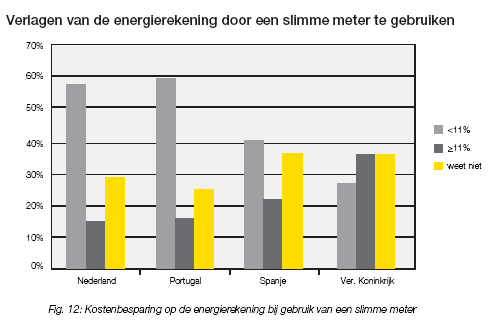 Aangezien er van de 7,15 miljoen huishoudens in Nederland er ongeveer 30.000 zijn met zonnestroompanelen op het dak (ruim 0,4%, en nog steeds druppelsgewijs tergend langzaam groeiend), zouden er op die 1.000 Nederlanders dus mogelijk 4 geweest kunnen zijn die misschien (als ze zich van hun metersituatie bewust zijn...) de nodige bezwaren hadden kunnen uiten tegen dat onverwachte moois wat mogelijk hun wettelijk verplichte saldering ongevraagd in de war zou kunnen brengen. Maar die 4 huishoudens zijn, gezien onderstaande grafiek van pagina 17 (van het gelukkig slechts 20 pp. tellende rapportje) beslist niet de enigen die zo hun bedenkingen hebben over de "impact" van die moderne nieuwe meter. Net als de Portugezen, zo blijkt. Maar zelfs de Engelsen, waar al de nodige "slimme meters" zijn geplaatst, zijn voor minstens een kwart niet overtuigd van een grotere impact (nog steeds niet bewezen, maar verondersteld) dan 11% lager elektraverbruik in hun eigen huishouden, terwijl zelfs daar nog een formidabel deel van ongeveer 37% "weet niet" invult over de mogelijke positieve impact op het aantal verbruikte kilowattuurtjes. Dat zou toch de nodige wenkbrauwen moeten doen fronsen bij de politiek, die de belangenorganisaties (EnergieNed e.d.) nogal makkelijk napraat over de potentiële "positieve" impact op het verbruik bij consumenten. In een ander grafiekje in het rapport (fig. 9 op pagina 14) bleek al dat maximaal 15% van de ondervraagden in Nederland wel eens van een "slimme meter" gehoord hadden (in Spanje was dat nog slechter gesteld).