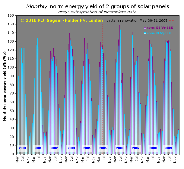 Genormeerde maandopbrengst per groep AC modules zie ook: genormeerde maandopbrengsten per jaar (deelsectie jaaroverzichten) 1. Genormeerde maandopbrengst per groep AC modules update datum grafiek: 1 maart 2010 Uitleg In deze grafiek wordt de genormeerde maandopbrengst in de loop van de tijd getoond voor twee groepen AC-modules sinds (de onvolledig gemeten maand) maart 2000 en waarvoor de resultaten telkens kolomsgewijs naast elkaar zijn gezet (93 Wp modules lichtblauw; 108 Wp modules paars). Het ogenschijnlijke verschil in tint blauw van de 93 Wp groep "voor" resp. "na" installatie van de 108 Wp groep op 12 oktober 2001 is een "optisch kleureffect", veroorzaakt door de sterk contrasterende paarse kolommen van de 108 Wp groep. Deze (en de volgende) "genormeerde" grafiek is gecorrigeerd voor inverter defecten en geeft dus continu normopbrengsten weer zoals die voor een "optimaal functionerend systeem" zouden zijn behaald, behalve voor maanden waarvoor het resultaat is geëxtrapoleerd uit het resultaat van minstens 14 gemeten dagen in die maand (vakantiemaanden waarin deels niet gemeten kon worden; basis van de kolom grijs gekleurd). Maanden met gedeeltelijk niet gemeten periodes, maar waarvoor de ochtend meterstanden van de 1e en de avond meterstanden van de laatste dag wel bekend waren (en dus ook de er uit berekende normopbrengsten) zijn met de normale kleuren weergegeven. Bovendien worden in de normopbrengsten geen schaduweffecten uitgefilterd, dus in de maanden oktober-maart is de opbrengst van de 108 Wp groep iets minder dan er van verwacht zou kunnen worden als alle 6 modules volkomen schaduwvrij zouden blijven. De verliezen door de beschaduwing van 4 van de 6 modules blijven echter binnen de perken (max. 1-2% van de totale jaaropbrengst van het gehele systeem, zie schaduweffecten artikelen). 93 Wp groep: De hoogste genormeerde maandopbrengst die tot nu voor de groep van 4 93 Wp panelen is gehaald/berekend is 143,5 Wh/Wp voor recordmaand juli 2006, die het vorige record (131,0 Wh/Wp voor juni 2003) volledig aan scherven heeft doen gaan. Het resultaat voor juni 2001 (133,8 Wh/Wp) is niet reeël, maar gebaseerd op een extrapolatie van onvolledige gegevens voor die maand. Volgens de Zonnewijzer bleek mei van 2001 met kop en schouders boven de theoretisch te behalen opbrengsten van de toen gemeten periode sinds maart 2000 uit te steken. De berekende theoretische cumulatieve opbrengst voor mei 2001 was volgens de Zonnewijzer ongeveer 48 kWh, voor juli 2002 ongeveer 42 kWh. Als we van de gerealiseerde normopbrengst voor de volledig gemeten maand juli 2001 uitgaan (totaal geproduceerd door 4x 93 Wp 45,849 kWh, dus normopbrengst is 45.849/372 = 123,3 Wh/Wp), zou mei 2001 een geëxtrapoleerde normopbrengst van 48/42 x 123,3 = ongeveer 141 Wh/Wp gehad kunnen hebben, maar dat haalt het dus net niet bij het inmiddels gemeten record van juli 2006. Let wel: dit record is behaald terwijl er 25 meter 2,5 mm² DC-bekabeling ligt, terwijl dat vóór eind mei 2005 AC-bekabeling was waar verliezen veel minder relevant zijn. Tenslotte qua records ook goed op de absurde opbrengst van de voorjaarsmaand april 2007 letten: deze maand is de op een na hoogste qua opbrengst, wat al aangeeft dat opbrengstrecords niet alleen in de zomer behaald hoeven worden. Het "dieptepunt" werd voor de renovatie bereikt tijdens de regenrijke en sombere december van 2002 waarin de normopbrengst op 14,0 Wh/Wp bleef steken (gecorrigeerde berekening i.v.m. grootste deel van de maand uitgevallen omvormer). Na renovatie gaf december 2006 een nog slechtere maandproductie te zien, nl. een miezerige 11,4 Wh/Wp. Normaal gesproken schommelen de genormeerde maandopbrengsten rond de 100-125 Wh/Wp in de zomerperiode en vallen ze terug tot onder de 20 Wh/Wp in de winter. Doordat korte termijn weerseffecten over de relatief lange periode van 28-31 dagen per maand worden uitgemiddeld, zijn de schommelingen tussen de maandopbrengsten i.t.t. die voor de weekopbrengsten nauwelijks relevant. De grafiek geeft dus al een stuk betrouwbaarder indicatie van de werkelijke effecten van de seizoenen op de (genormeerde) opbrengsten van het PV-deelsysteem. Ondanks de "uitmiddelende" effecten van maandcurves, is daarom het extreme verschil in weertype in het grillige jaar 2006 goed te zien: een gortdroge recordmaand juli met 2 hittegolven werd gevolgd door een volkomen verregende augustusmaand, wat de grafiek voor 2006 een curieus uiterlijk geeft. Ook de grafiek voor 2007 is "byzonder" geworden: april was extreem zonrijk, terwijl juni en juli zwaar tegenvielen. 108 Wp groep: Sinds oktober van 2001 meetresultaten beschikbaar, voor de eerste maand echter slechts gedeeltelijk (vanaf de 12e van die maand, dus niet goed te vergelijken met de normopbrengst van de 93 Wp groep omdat die over de volledige maand oktober is gemeten/berekend). De (gemeten) extremen voor deze groep AC modules zijn: 148,5 Wh/Wp voor juli 2006 (vorige record was 139,9 Wh/Wp voor juni 2003), resp. 10,7 Wh/Wp in dezelfde decembermaand (2002) die bij de 93 Wp groep al werd genoemd vóór, resp. 8,9 Wh/Wp ná systeemrenovatie in december 2006. Ook al was december 2002 o.h.a. erg somber, door de paar zonnige dagen in die maand kwam de (genormeerde) maandproductie van de 93 Wp groep toch weer boven die voor de 108 Wp groep te liggen door de beschaduwingseffecten binnen de laatstgenoemde groep die de (genormeerde) opbrengst flink onder druk zetten. Vanaf februari is de 108 Wp groep echter weer de best presterende, met een fors verschil in normopbrengst in de zomer omdat de inverter/zonnepaneel combinaties effectiever zijn (lichte onderdimensionering van omvormer t.o.v. zonnepaneel) dan bij de 93 Wp zonnepanelen (lichte overdimensionering) onder onbeschaduwde condities (grootste gedeelte van het jaar). Aangezien we in het voorjaar van 2001 nog niet de beschikking hadden over de 108 Wp AC modules is het verwachte maximum voor mei 2001 (recordmaand volgens de Zonnewijzer in de periode dat wij zonnep