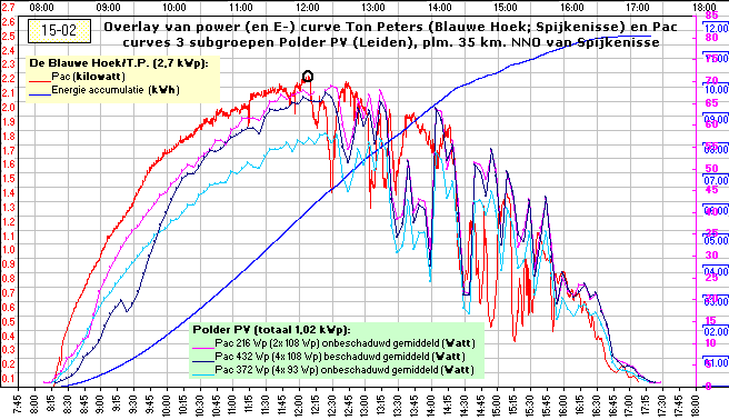 In deze figuur zijn via Excel (grafiek van Ton Peters als achtergrond van het betreffende blad) de Pac powercurves voor de drie subgroepen van Polder PV (in 1 grafiek) als overlay over de bladachtergrond gelegd en is net zo lang met assen en kaders geschoven tot de grafieken perfect op elkaar konden worden gepast, met corresponderende X-coördinaten. Let daarbij wel op dat de vermogenscurve voor het 2,7 kWp systeem van Ton Peters in kilowatt op de Y-as staat vermeld (linker Y-as, rode cijfers), en dat de vermogenscurves voor de 3 deelgroepen van Polder PV (op de rechter Y-as, in roze cijfers) in watt AC-vermogen zijn weergegeven (let wel: aangegeven wordt het gemiddelde vermogen per paneel in die subgroepen). Het gaat hier vooral om de vorm van de verschillende curves. 15 februari was een zeer zonnige dag met fel schijnende zon, zacht voorjaarsachtig weer, en in de middag opkomende lichte sluierbewolking met gaten ertussen.