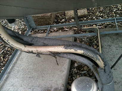 25 februari 2010. Oeps! Ballast vaudje... Een iets te haastige/slecht opgeleide aannemer had blijkbaar niet goed op de ballast en/of het gebruiksvoorschrift van het bouwliftje gelet toen deze zonnepanelen richting het dak omhoogbracht. Fors schadegevalletje...